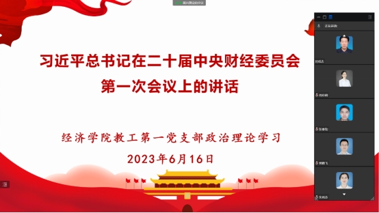 2023年5月5日,习近平总书记主持召开二十届中央财经委员会第一次会议并发表重要讲话。为深入领会习近平总书记重要讲话精神,贯彻落实党中央经济工作部署,体现新时代哲学社会科学研究工作者的责任担当,为助力中国式现代化建言献策,新葡萄8883官网AMG教工第一支部于2023年6月16日,通过在线形式集体学习本次会议内容。