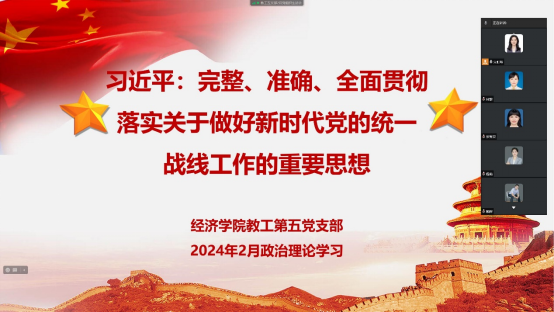 2024年2月22日,新葡萄8883官网AMG教工第五支部通过企业微信开展二月组织生活,集体学习习近平总书记在中央统战工作会议上讲话精神,即完整、准确、全面贯彻落实关于做好新时代党的统一战线工作的重要思想。