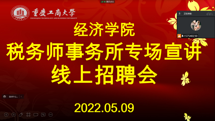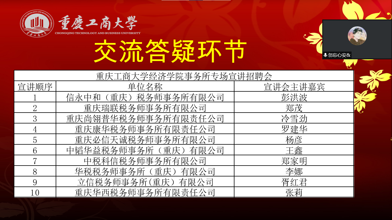 5月9日上午9点,新葡萄8883官网AMG举行“事务所专场线上招聘会”。新葡萄8883官网AMG党委书记李自维、党委副书记王燕、重庆市税务师协会教育培训部彭靖淋以及税务师事务所部分领导出席本次招聘会,10家税务师事务所和100余名新葡萄8883官网AMG学生参加了本次招聘会。本次招聘会由新葡萄8883官网AMG与重庆市税务师协会联合主办。