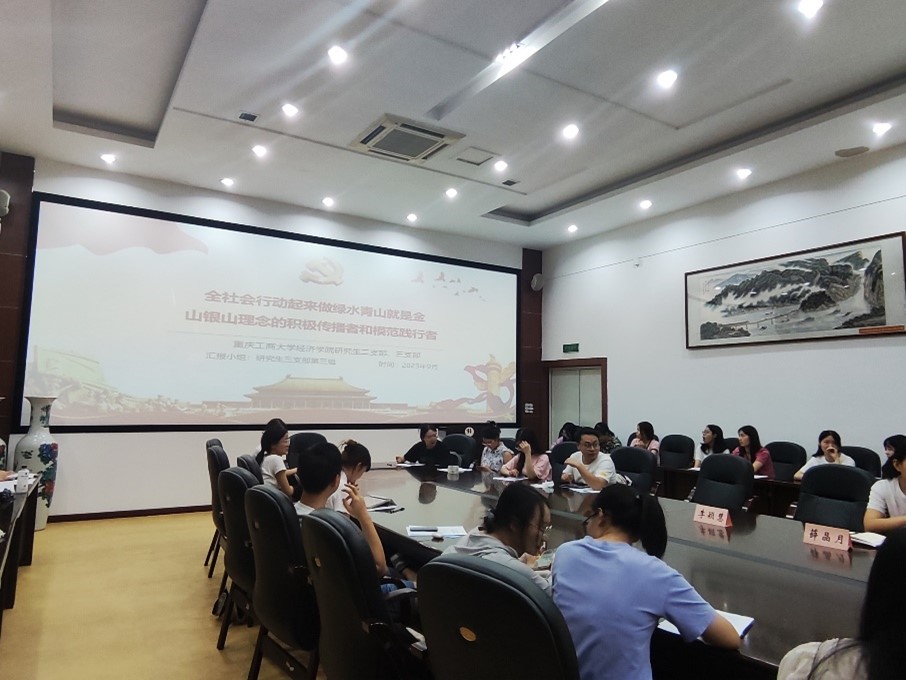 会议第五项,研究生三支部第三组的党员同志就“全社会行动起来,做绿水青山就是金山银山理念的积极传播者和模范践行者”主题做了专题分享。首先,就“两山论”的提出与发展历程做了简要介绍,由习近平总书记在首个全国生态日之际作出的重要指示;其次,阐述了“两山论”的科学内涵,其体现了人与自然和谐统一的辩证关系、经济发展与生态保护协同并进的理念以及以人民为中心的生态价值追求;然后介绍了“两山论”的重庆探索与实践;最后从形成共识提升整体合力、着力发展绿色生态产业、探索打通“两山论”转化通道三个方面,概述了重庆践行“两山论”主要建议。