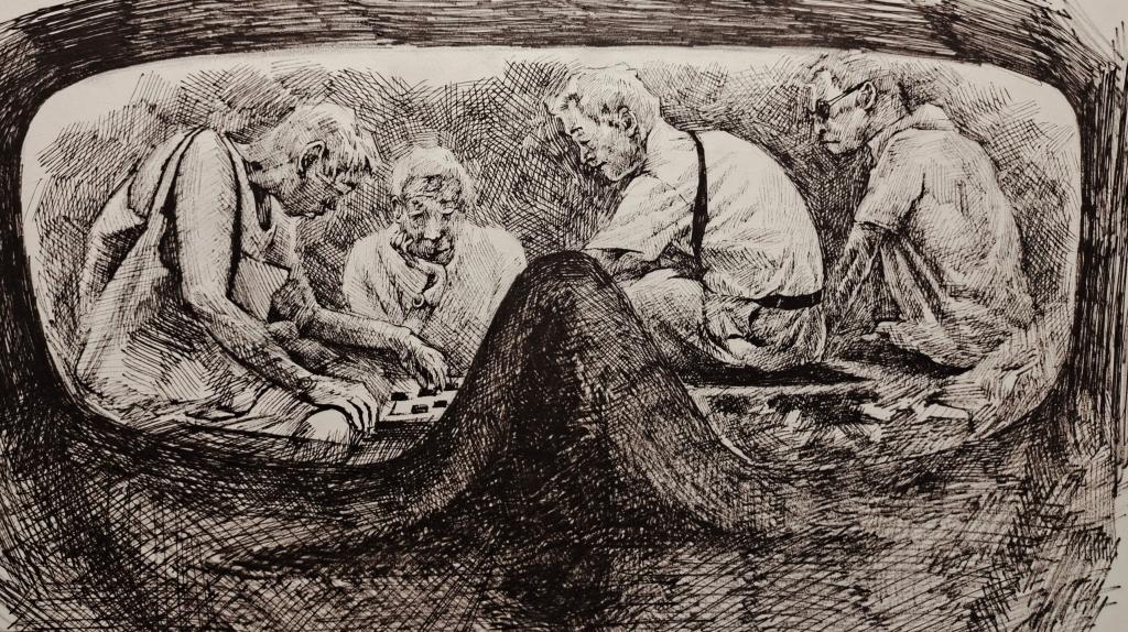 这幅画呈现的内容是护目镜里面几位大爷在悠闲地下棋。背后的深刻寓意是:在抗疫医护人员的辛苦付出的背后才有我们的幸福生活,我们应该致敬并且大力支持他们,他们才是真正的民族英雄,没有他们在一线的拼死守护,我们何来的美好生活?