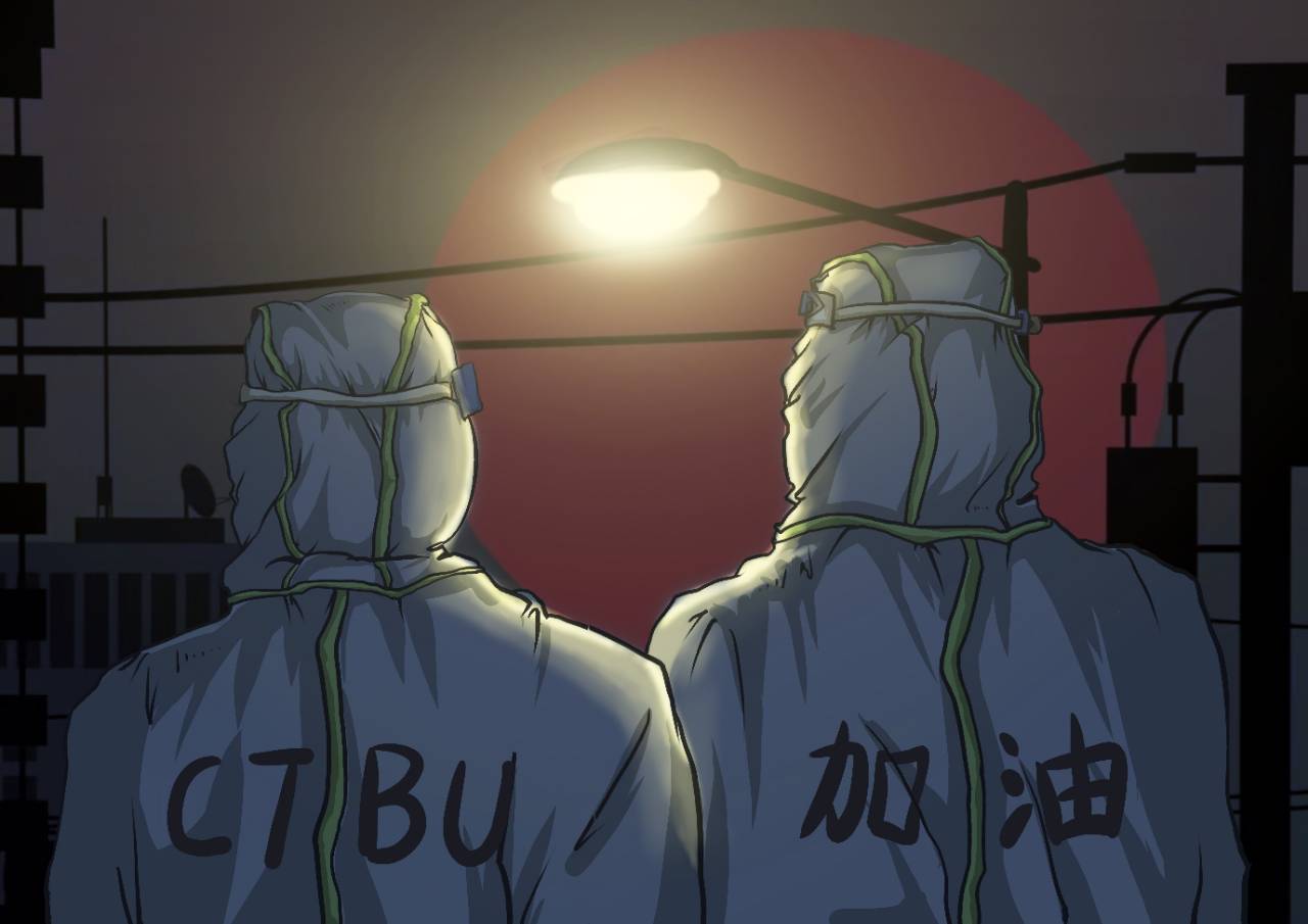 疫情当下我们要做好防控,静待花开。C表达终有一天我们可以战胜疫情,拥抱青春;T为重工商标志建筑钟楼;B表示工商学子有每日体温自查、戴口罩、勤洗手的防疫措施,做好自身防护;U则是高新区爆发疫情后,医护人员为我们做核酸检测的场景,为我们的人身安全提供进一步的保障。相信我们重工商学子可以战胜疫情,共赏春光!