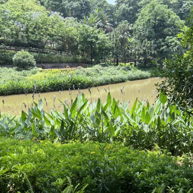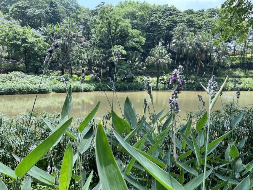 再力花兼具观赏价值与生态价值,是翠湖水岸的颜值担当与生态卫士。其株型挺拔、叶形优美,常年翠绿的姿态为翠湖增添了持续的自然美感;同时根系具备净化水质的能力,能改善水体环境,守护翠湖的生态平衡,成为校园水域生态的重要组成部分。